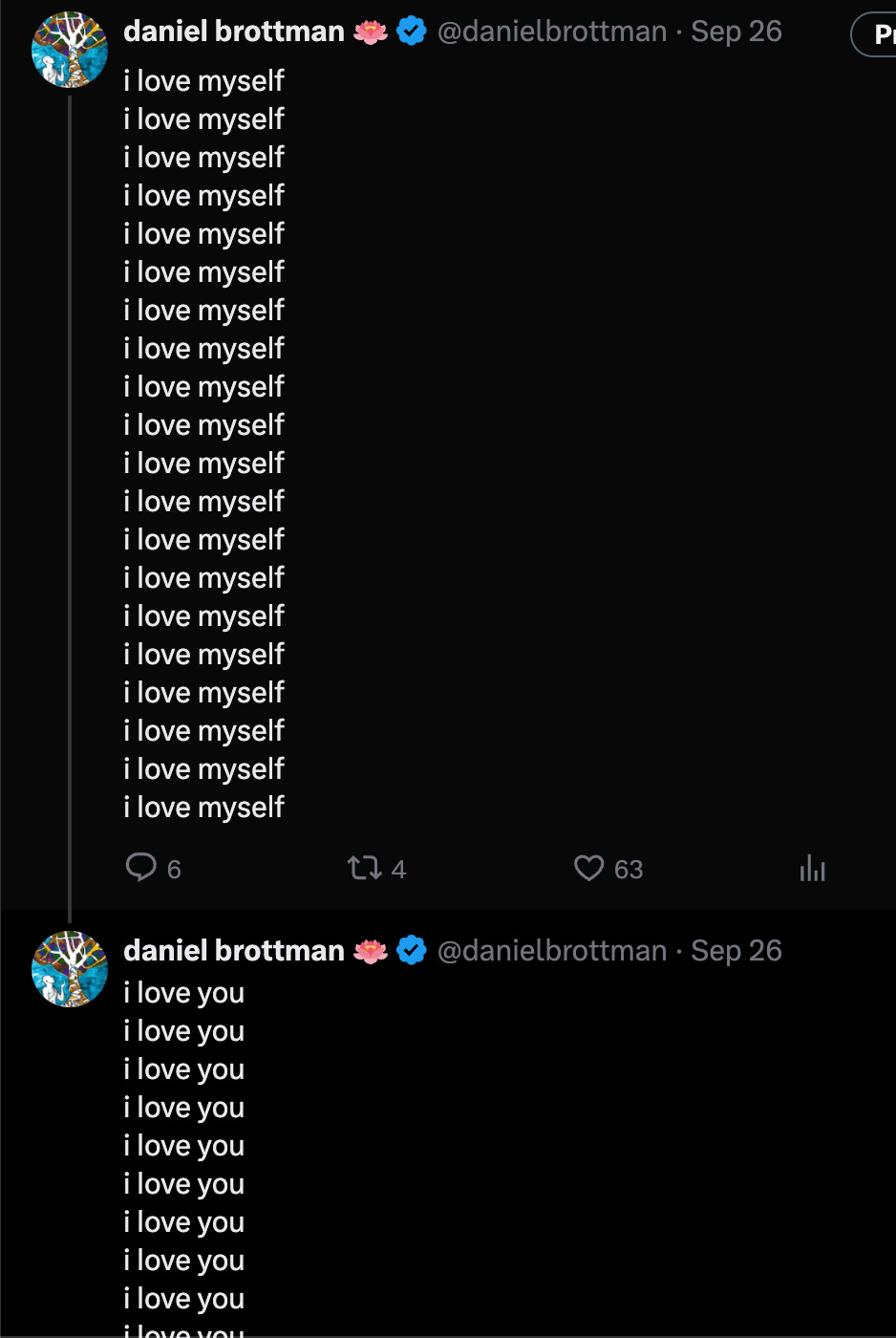 i listened to like the first 1/5th of the audio book of “love yourself like your life depends on it” by kamal ravikant recently, and it was well worth it just for this extremely simple practice the author self-discovered and recommends: repeat the phrase “i love myself” in your head as often as you can remember.