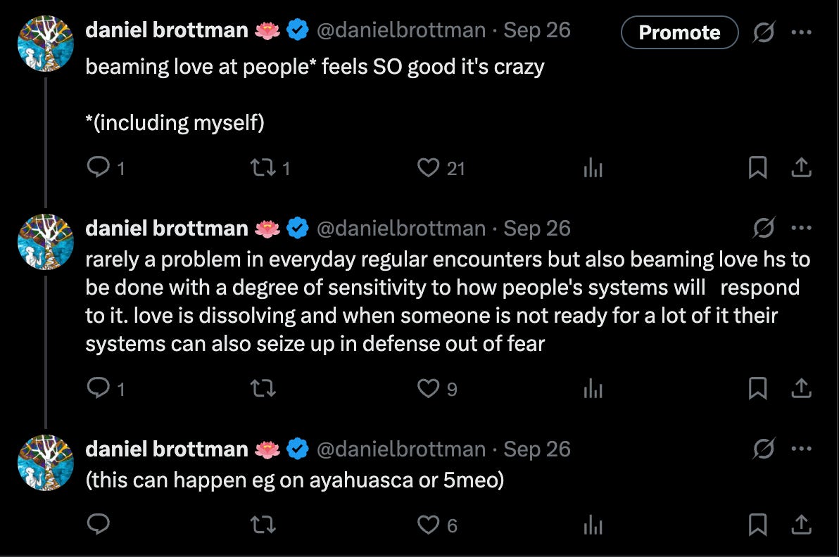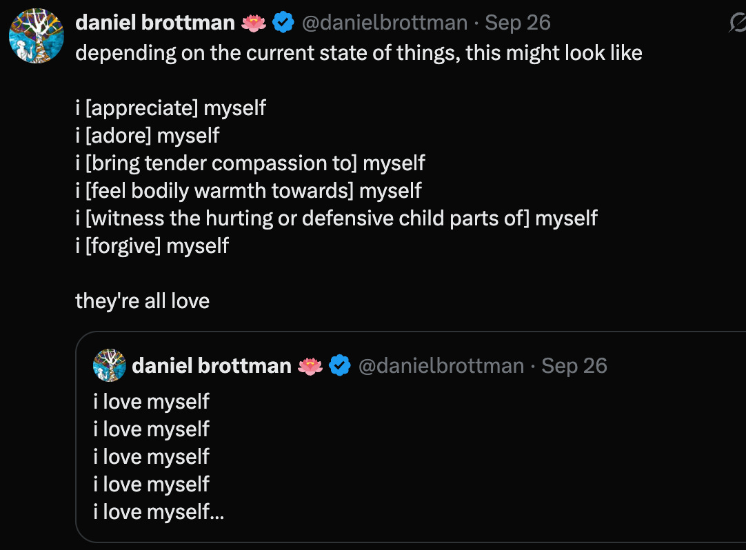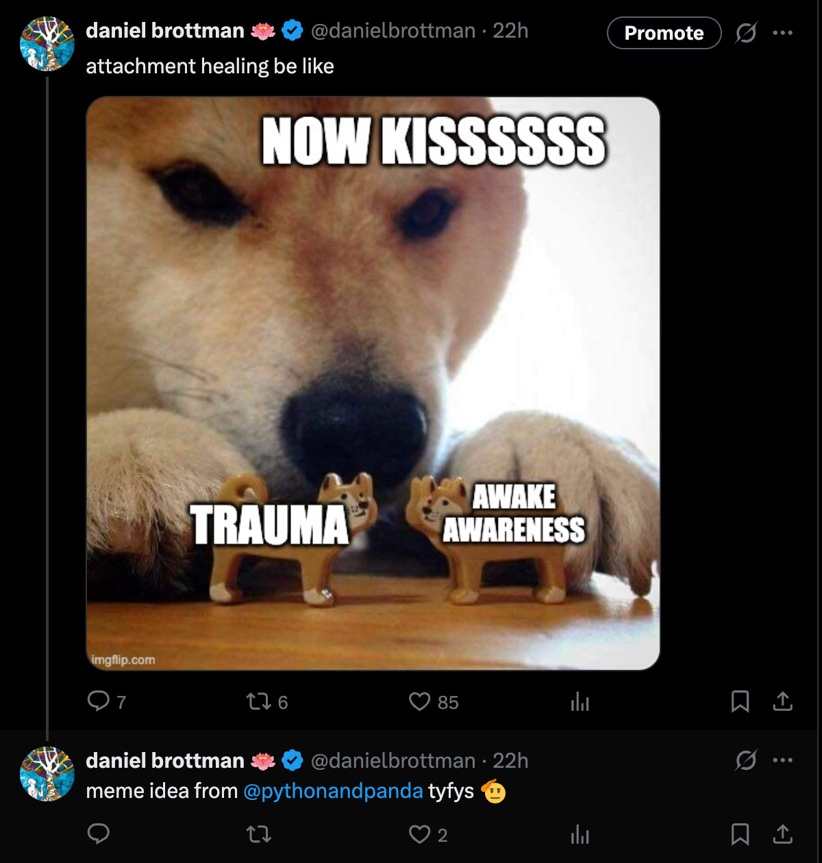 I related to and felt some of my experiences validated by content in this post! How you looked at me in our eye contact meditation at ZMM is reverently preserved in my memory. I appreciated the tweet about respecting others by being sensitive to how much love they are able to receive. I hadn’t thought of it like that but I am recalling three instances (all from that wonderful ZMM place) when I perceived a love that overwhelmed me. How strange! I don’t understand… I want to be loved… what does that even mean that it was too much? Also, I like that meme at the bottom. We can heal, and the healing extends beyond us. Ain’t no work like the inner work. Thank you for your practice.