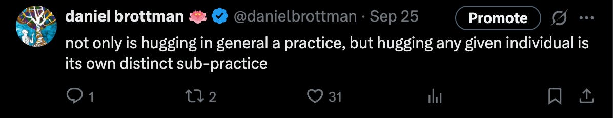 what is my body saying when i hug? can i hug without needing something from you? can my body truly communicate my care and affection for you? can i be deeply attuned to the subtle information from your body as i hug you? can i come into any hug with an open heart? can i honor the aliveness of where our particular relationship is at right now, in this moment, with this hug? can i honor my own boundaries with this hug? can i let this hug go when its natural life has ended, but no sooner?