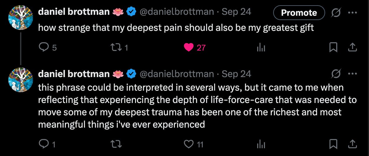 i learned from chloe that there’s sort of a two step process here: for many of us, even just learning to access this deep material (deep grief, fear, rage, etc) and feel it at all is huge progress. but eventually in order to start to really change patterns, that material also has to be met and seen and loved (as described in the previous section of this essay).