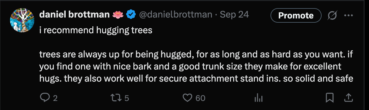 trees are cool because they are kind of both manifest and imagined - i get to hug the tree and really feel it! it’s really there, really in my arms, really holding me. and from there i get to imagine its care for me, and feel my love for it, my relief in being held and seen. imagining touch is an extremely important component of my practice of ideal parent figure, so it can be nice to have an actual living being who’s always available for hugs.