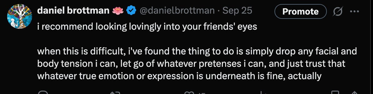 for some time now i’ve loved eyegazing as a practice. back at zen mountain monastery, some friends and i made a practice of sitting in meditation for a good 30 minutes, facing each other, maintaining eye contact. that practice rocks, and calls upon a lot of vulnerability, but i’ve found that when these moments happen spontaneously in the context of loving friendship, they’re even more powerful.