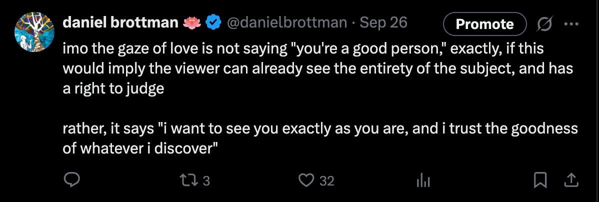 my system seems to be very sensitive to when i feel misattuned to. if *i* think that someone *else* thinks they understand me when *i* think they actually don’t, i get angry and defensive. and after all, no matter how well we know someone, aren’t they always a mystery to us? aren’t we always still a mystery to ourselves? so i think the loving gaze, for whatever quality of seeing the subject it has, also incorporates this not knowing, this wanting to see.